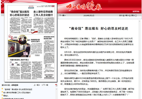 | ”救命錢(qián)”落出租車(chē) 首府好心的哥及時(shí)送還 |