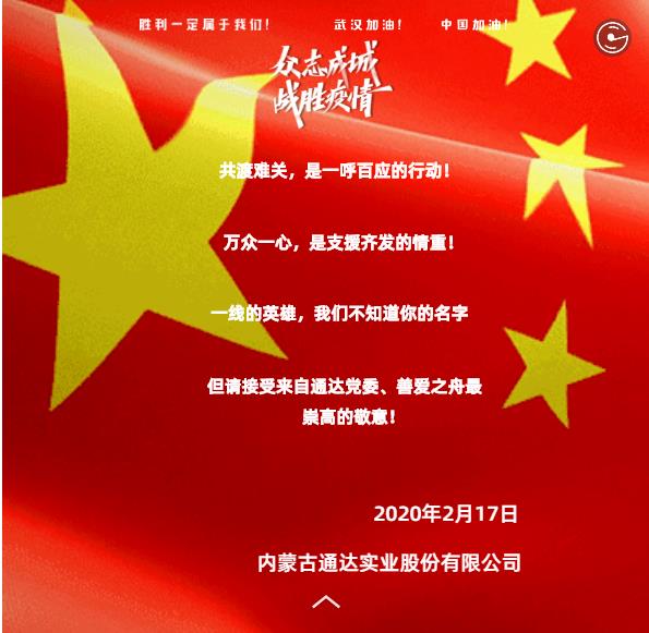 內蒙古通達實(shí)業(yè)股份有限公司在此次新型冠狀病毒肺炎疫情期間共對接7個(gè)政府部門(mén)進(jìn)行愛(ài)心物資專(zhuān)項捐贈活動(dòng),為在防控疫情一線(xiàn)的志愿者們累計捐贈20萬(wàn)元。