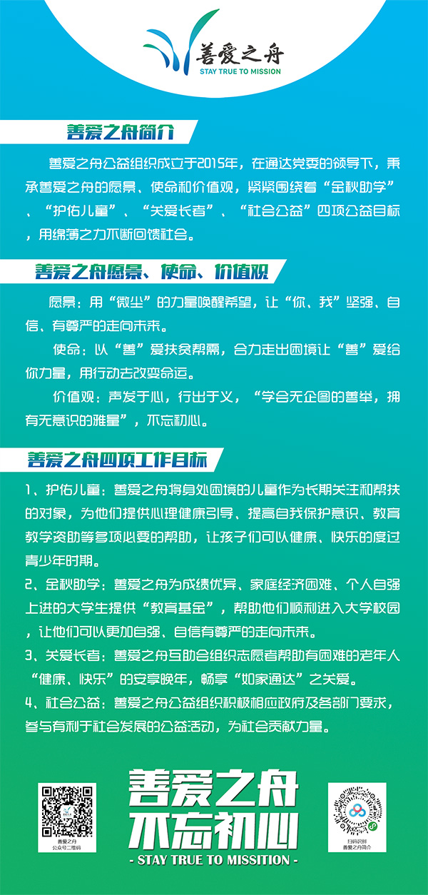 關(guān)注善愛(ài)之舟公眾號,點(diǎn)擊菜單欄助學(xué)報名——助學(xué)報名通道,閱讀助學(xué)海報了解善愛(ài)之舟及2020年善愛(ài)之舟金秋圓夢(mèng)公益助學(xué)說(shuō)明