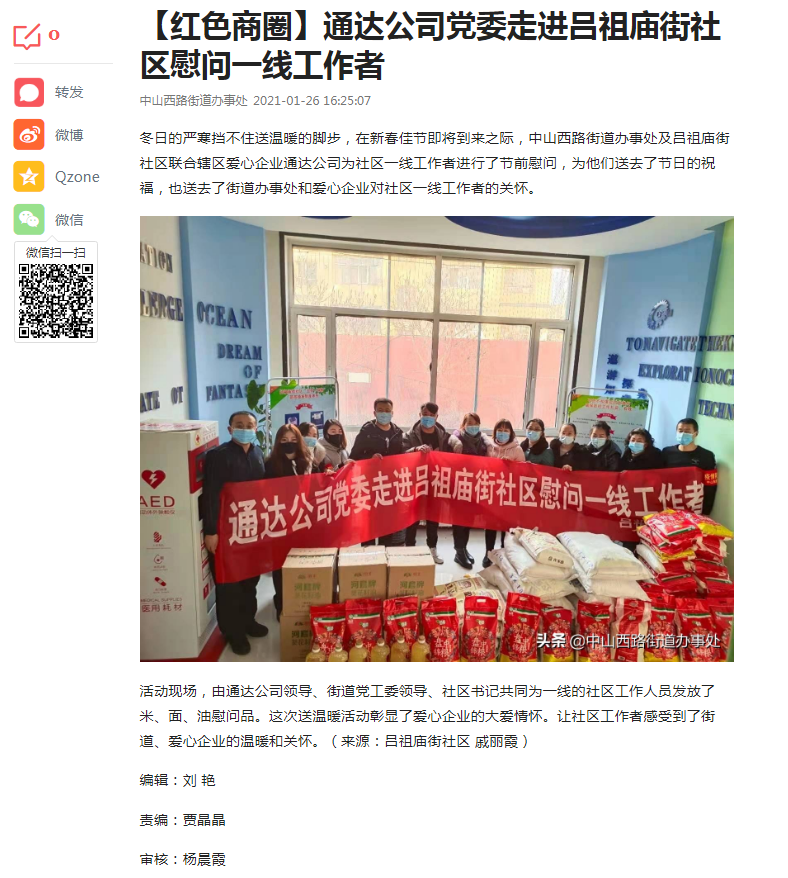 冬日的嚴寒擋不住送溫暖的腳步,在新春佳節即將到來(lái)之際,中山西路街道辦事處及呂祖廟街社區聯(lián)合轄區愛(ài)心企業(yè)通達公司為社區一線(xiàn)工作者進(jìn)行了節前慰問(wèn),為他們送去了節日的祝福,也送去了街道辦事處和愛(ài)心企業(yè)對社區一線(xiàn)工作者的關(guān)懷。